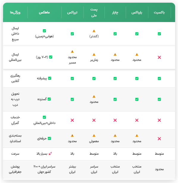 - خدمات جامع: شامل بستهبندی، بیمه، گمرک و مشاوره مسیر